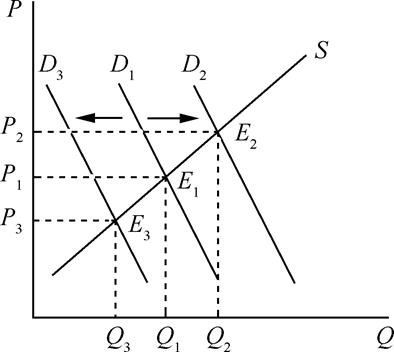 如图1-2所示,原先商品市场的均衡点为E1,即均衡价格为P1,均衡数量为Q1。如果需求从D1增加到D2,均衡点就会从E1点移动到E2点,于是,均衡价格上升到P2,均衡数量增加到Q2;反之,如果需求从D1减少到D3,均衡点就会从E1点移动到E3点,于是,均衡价格下降到P3,均衡数量减少到Q3。