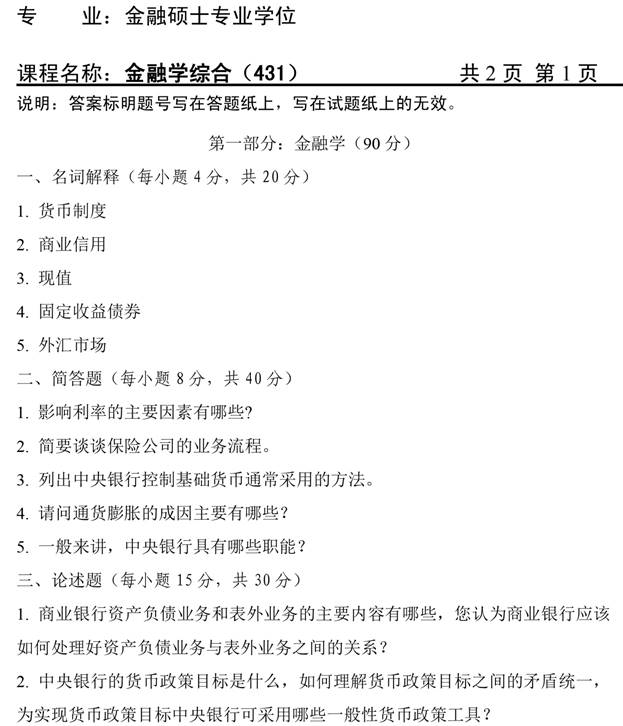 2. 全国名校金融硕士《431金融学综合》考研真题精选(部分视频讲解)