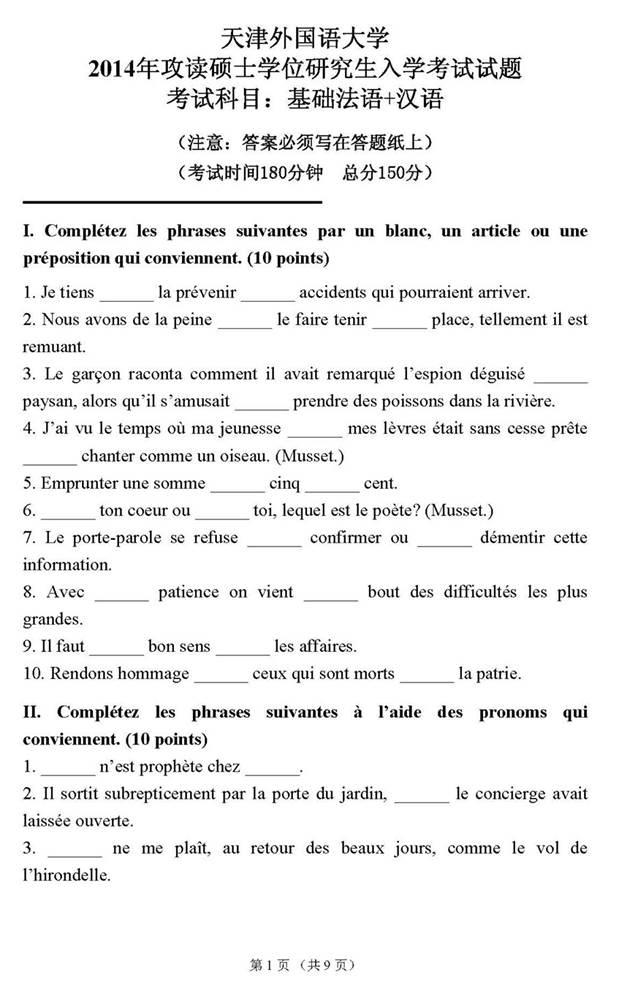 2014年天津外国语大学703(基础法语+汉语)考研真题