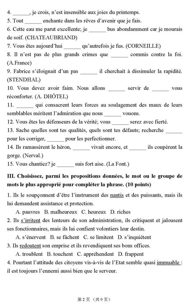 2010年天津外国语大学703(基础法语+汉语)考研真题