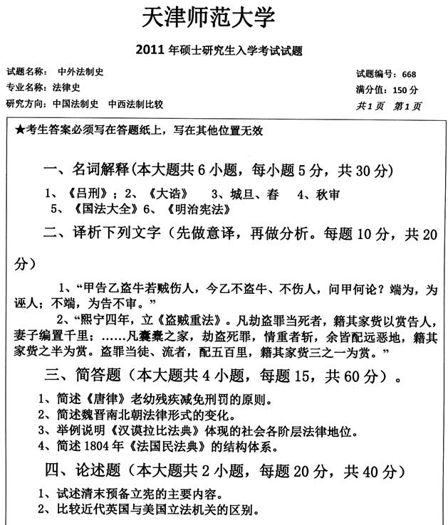2011年天津师范大学668中外法制史考研真题