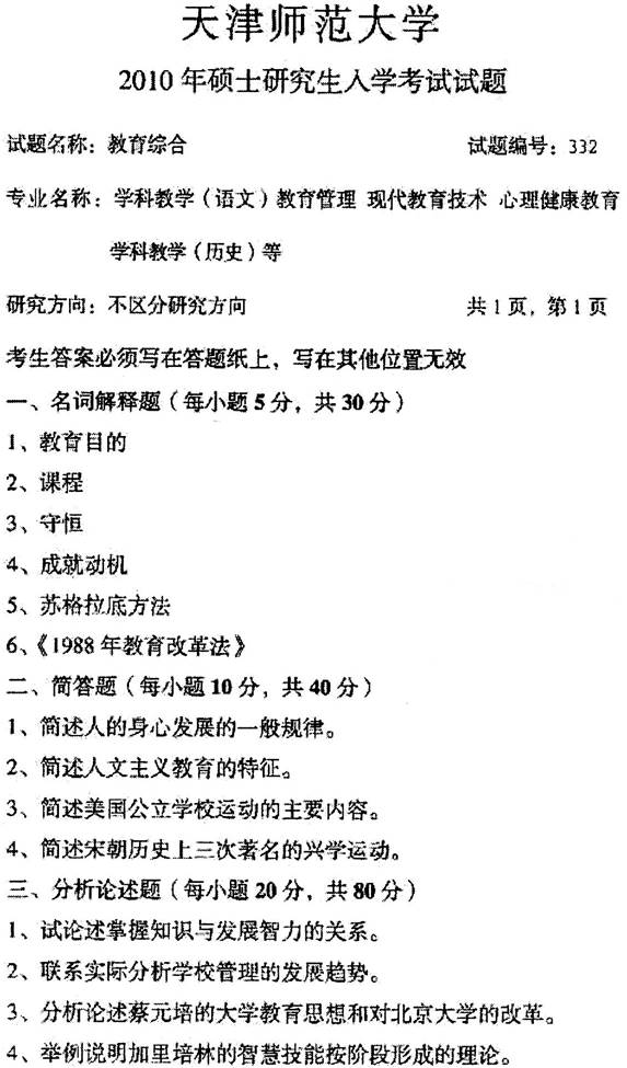 2010年天津师范大学《332教育综合》[专业硕士]考研真题