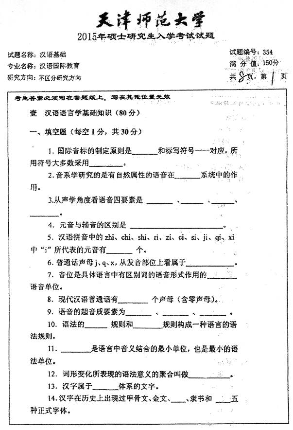 1. 天津师范大学国际教育交流学院《354汉语基础》历年考研真题汇总