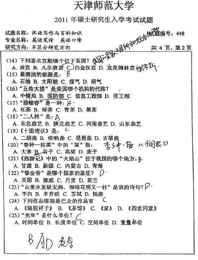 2014年天津师范大学448汉语写作与百科知识考研真题