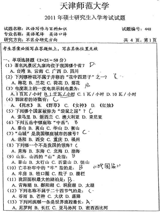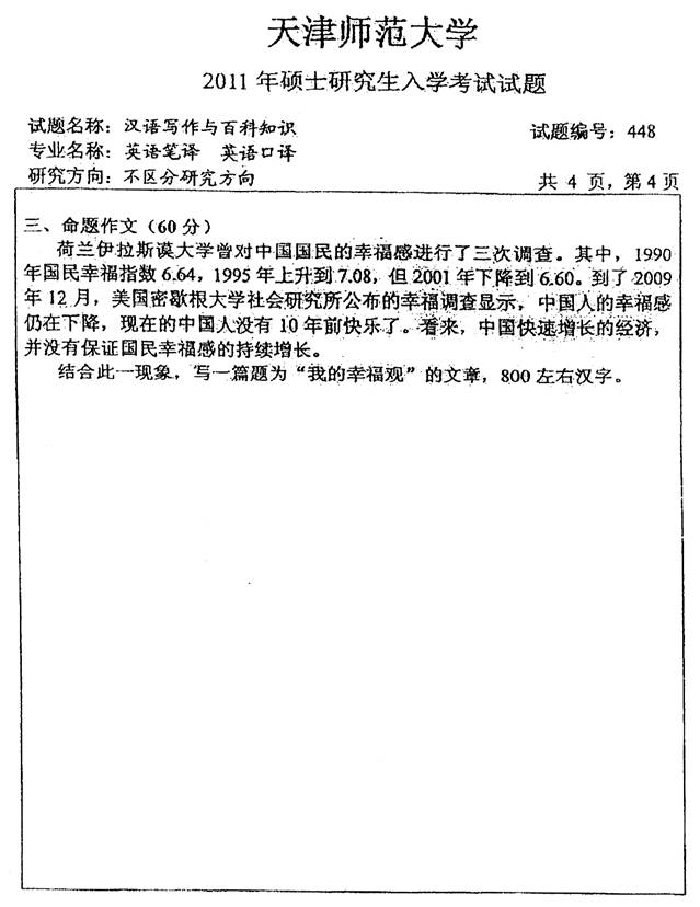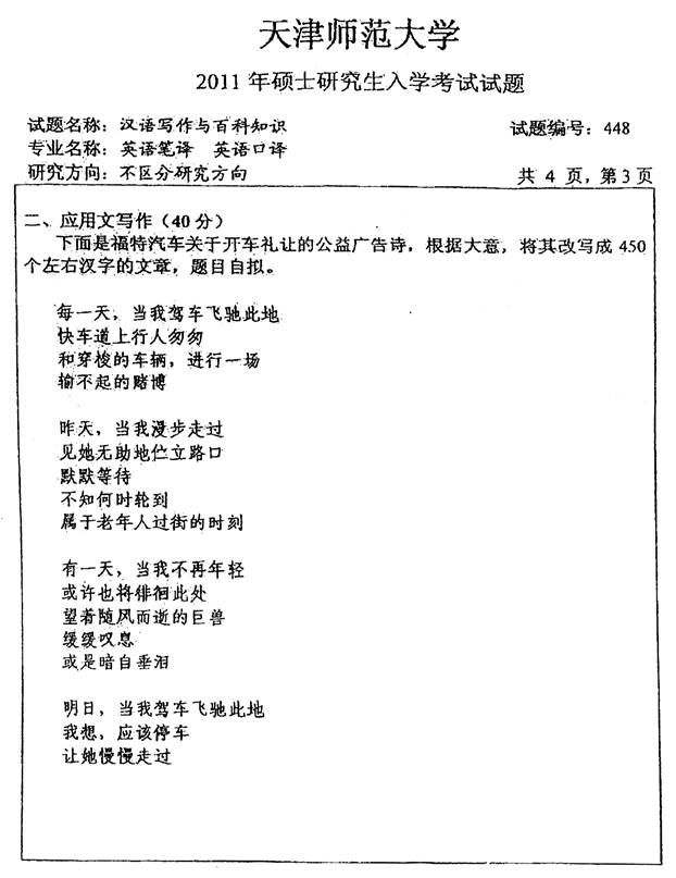 2011年天津师范大学448汉语写作与百科知识考研真题