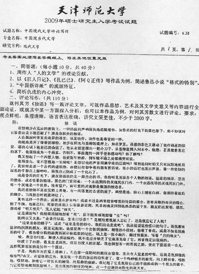 2009年天津师范大学638中国现代文学评论写作考研真题