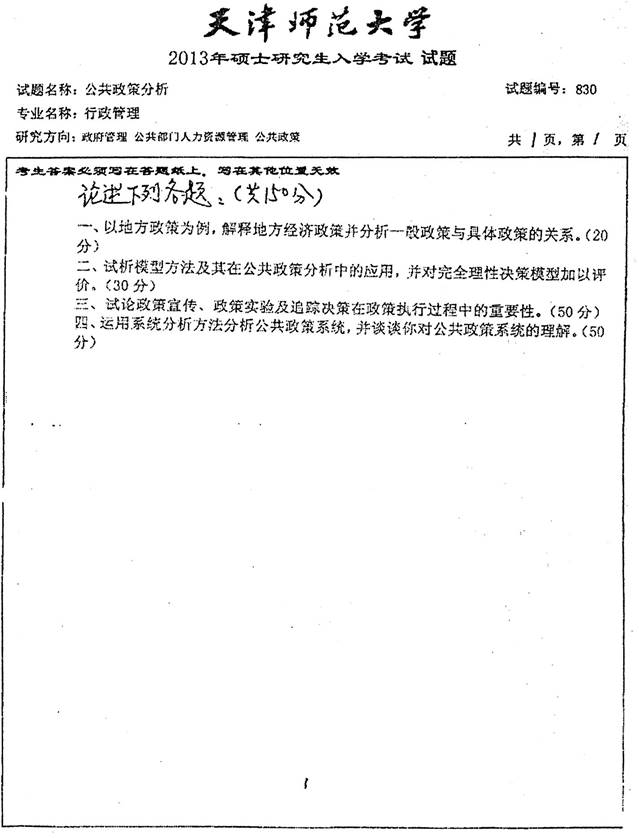 1. 天津师范大学政治与行政学院《830公共政策分析》历年考研真题汇总