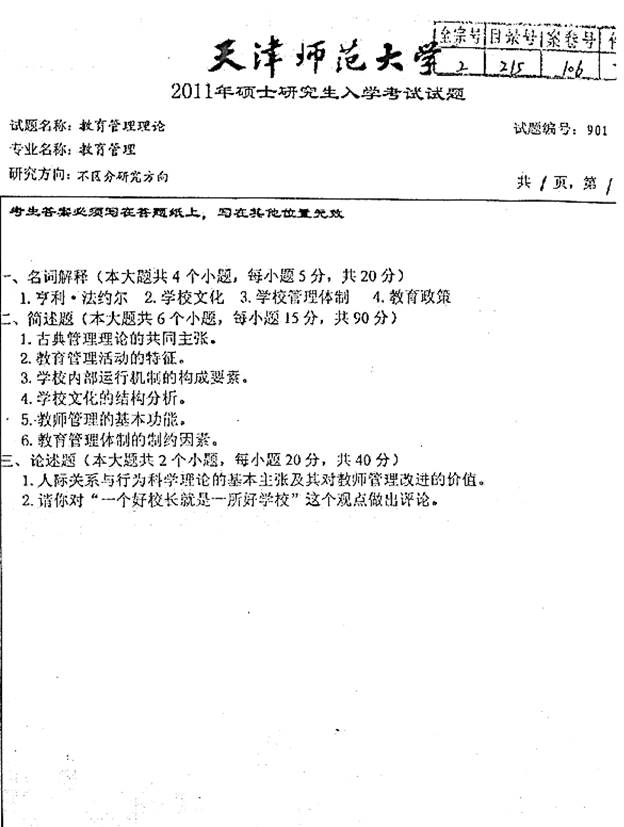 1. 天津师范大学教育学部《教育管理理论》历年考研真题汇总