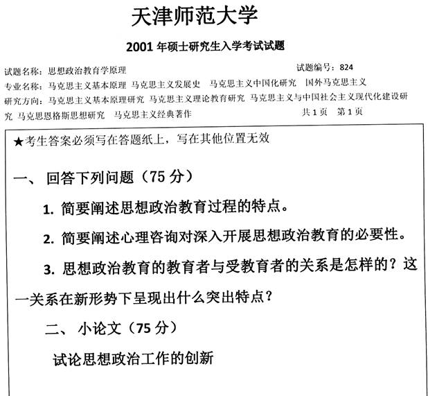 1. 天津师范大学马克思主义学院《思想政治教育理论》历年考研真题汇总