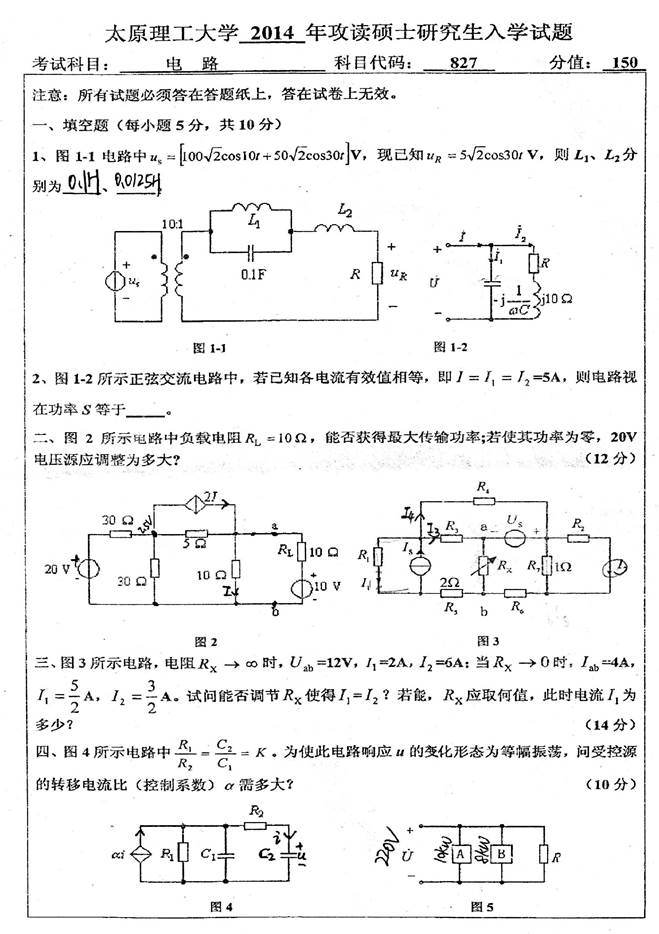 1. 太原理工大学电气与动力工程学院《827电路》历年考研真题汇总