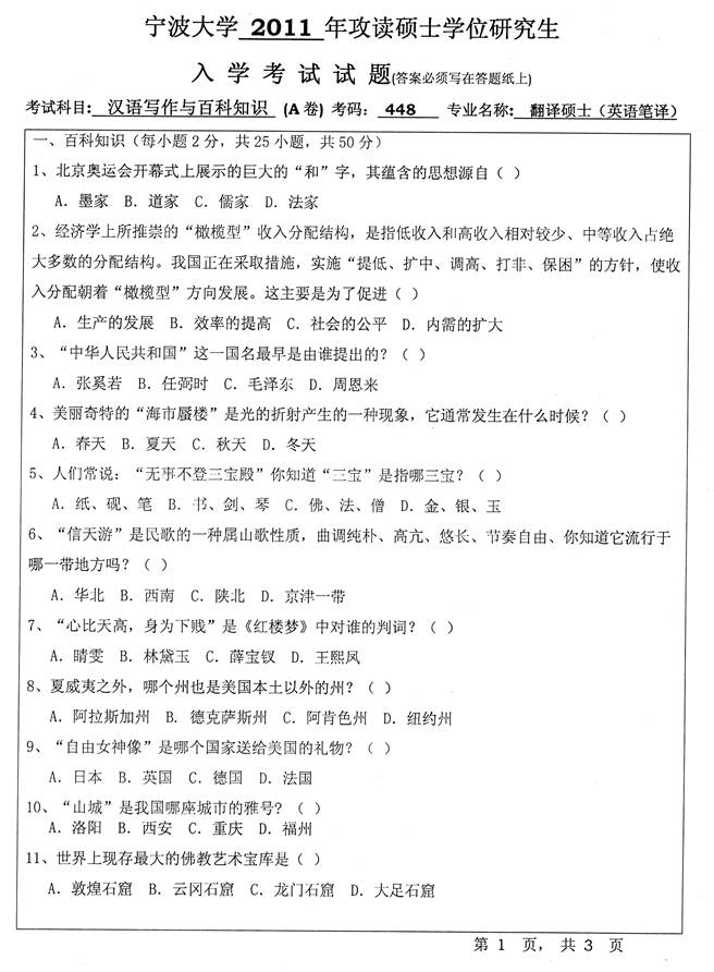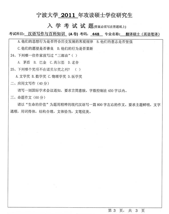 2011年宁波大学《448汉语写作与百科知识》考研真题
