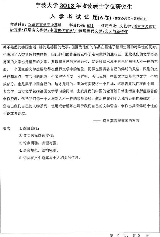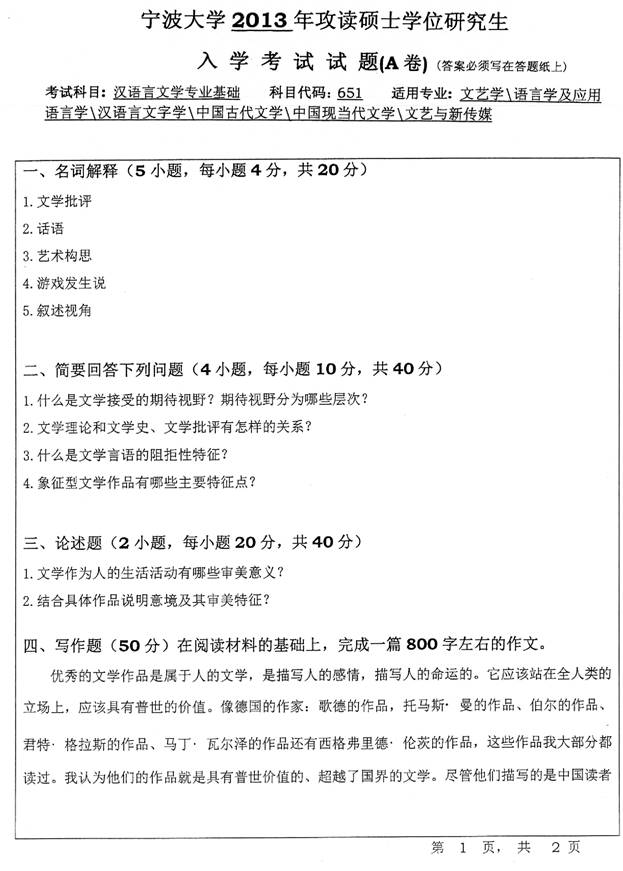 2013年宁波大学《651汉语言文学专业基础》考研真题