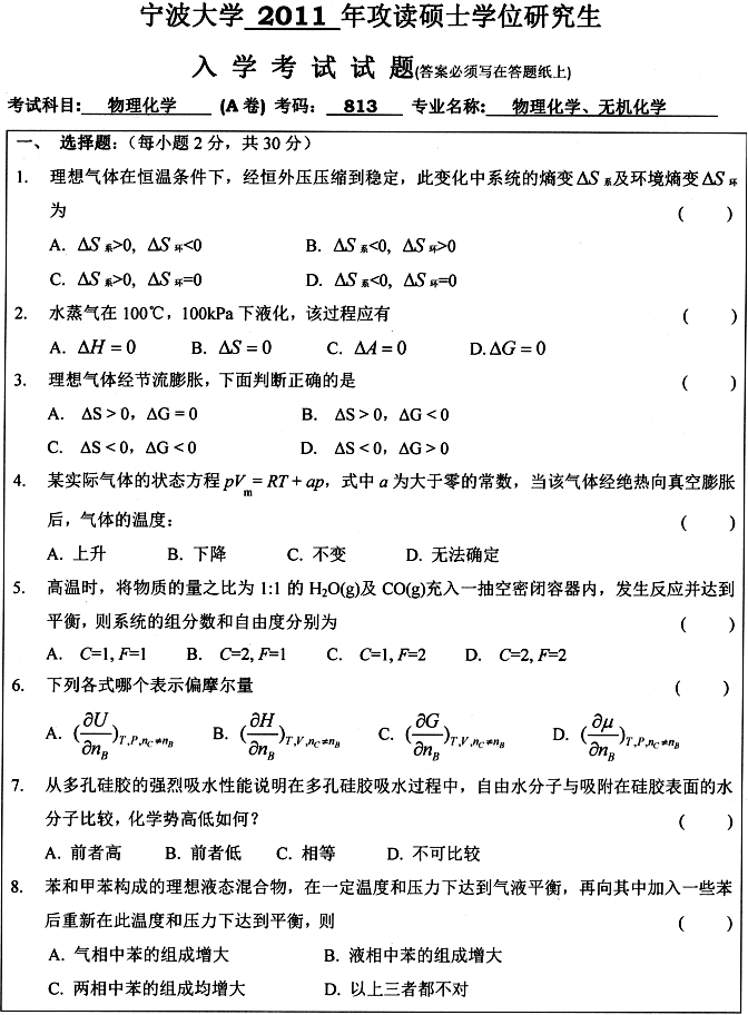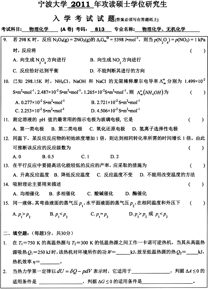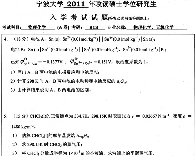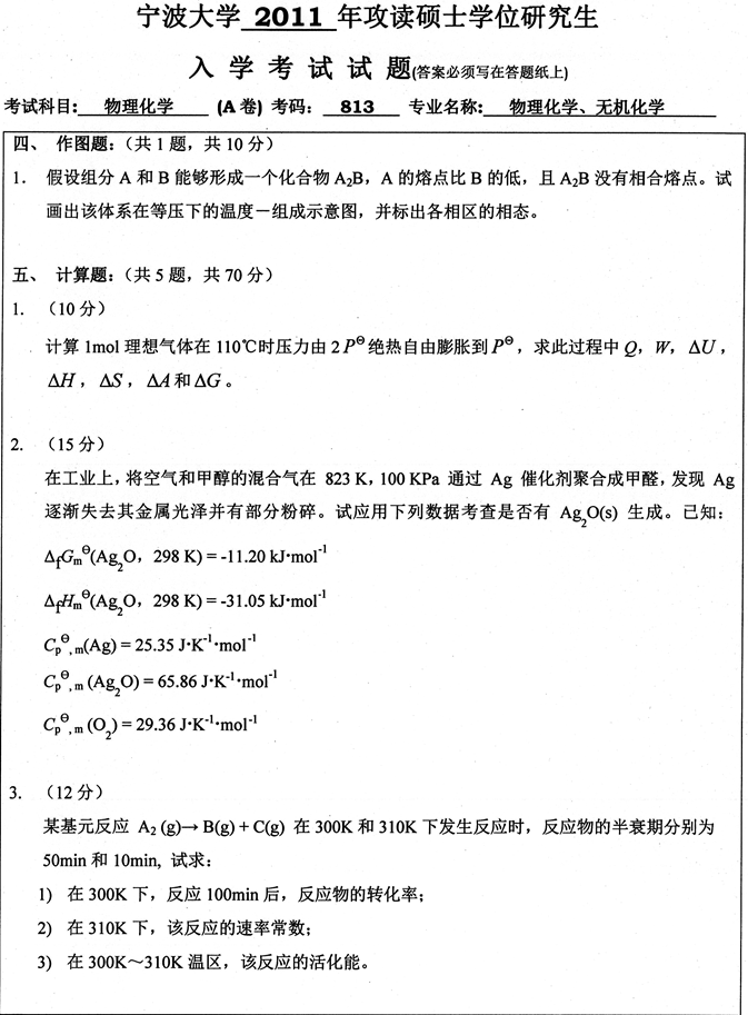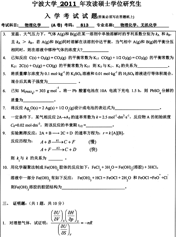 1. 宁波大学材料科学与化学工程学院《881物理化学》历年考研真题汇总