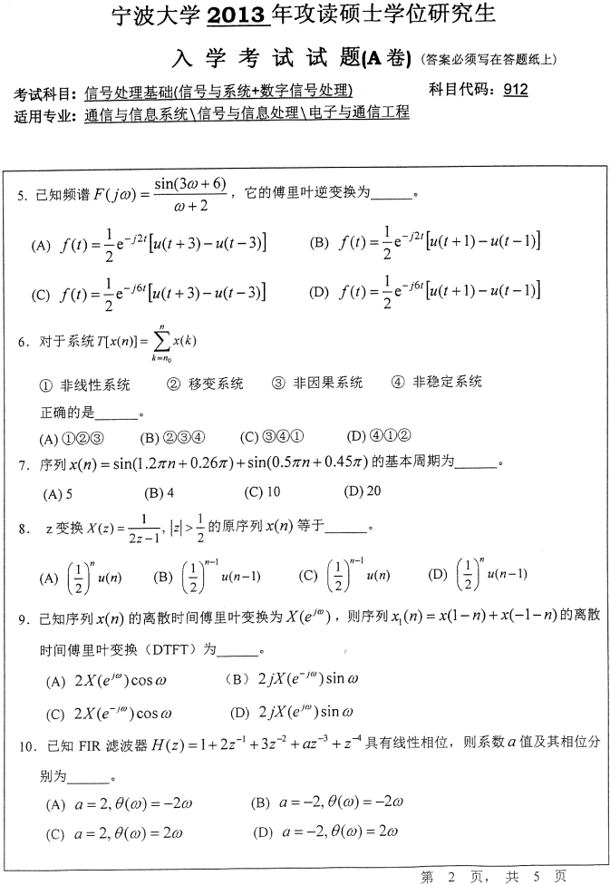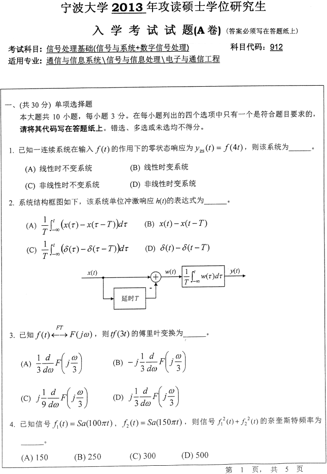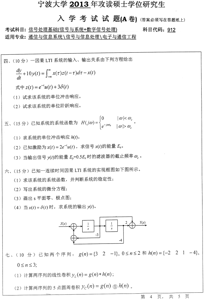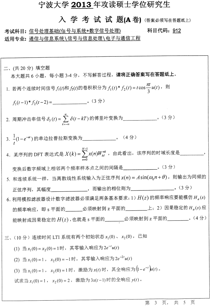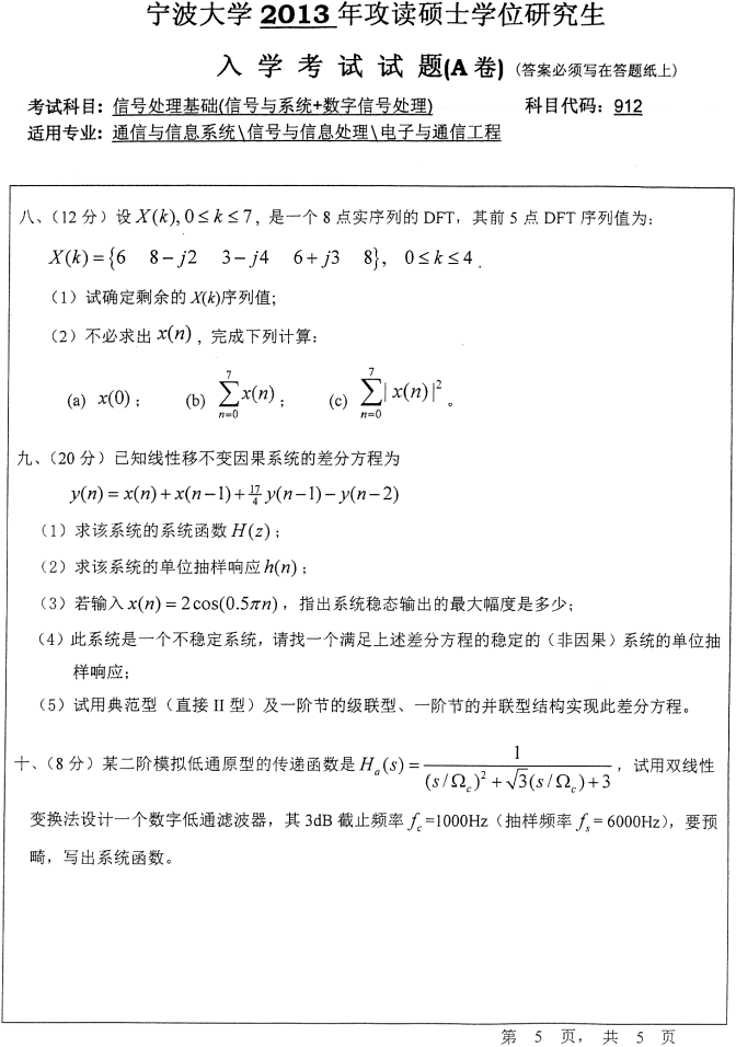 2013年宁波大学《912信号处理基础(信号与系统+数字信号处理)》考研真题