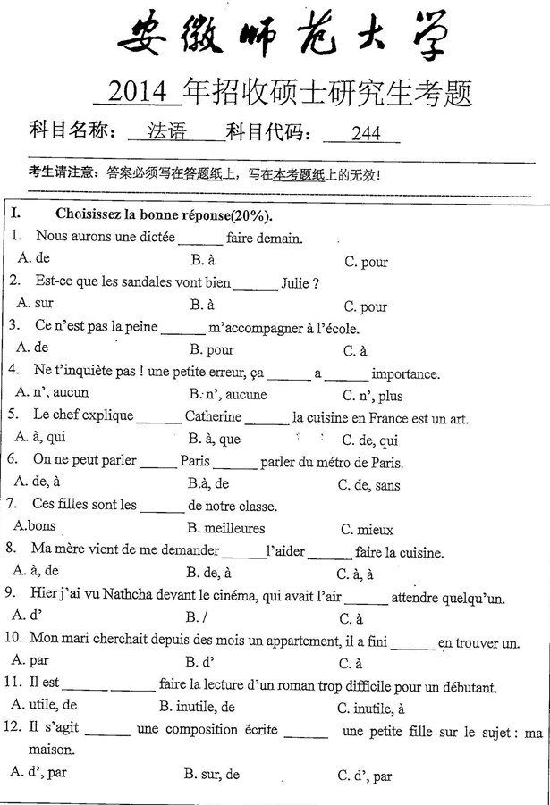 1. [电子书]安徽师范大学外国语学院《244法语(自命题)》历年考研真题汇总