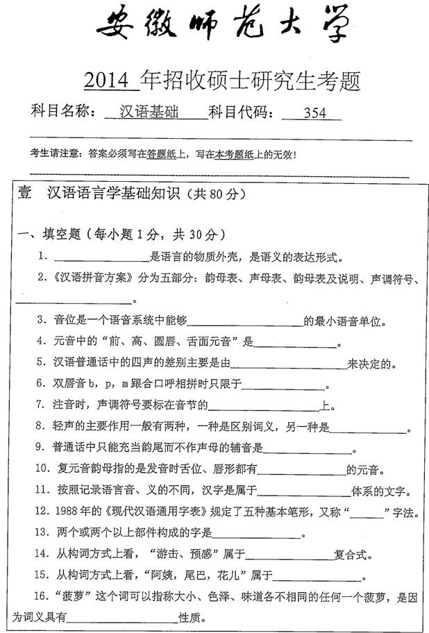 1. 安徽师范大学文学院《354汉语基础》历年考研真题汇总