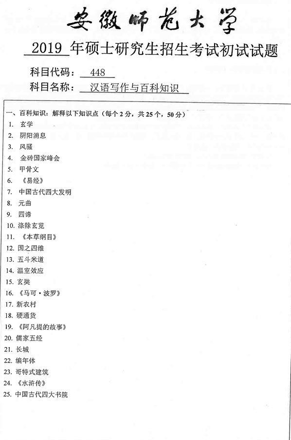 2019年安徽师范大学《448汉语写作与百科知识》考研真题