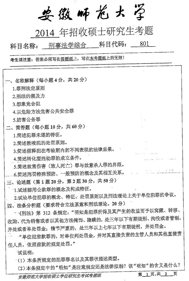 2020年安徽师范大学《800刑事法律综合》考研真题