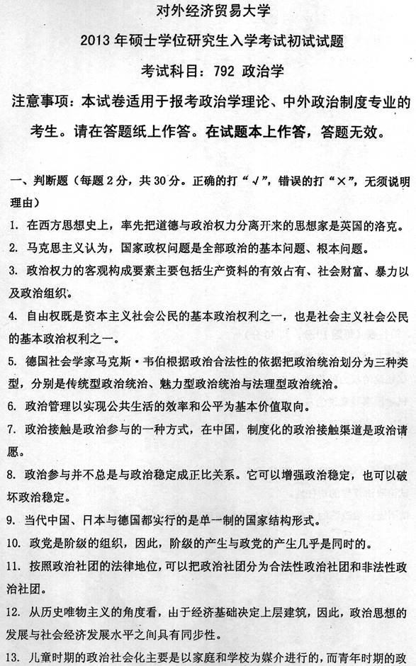 1. [电子书]对外经济贸易大学国际关系学院《791政治学基础》历年考研真题汇总
