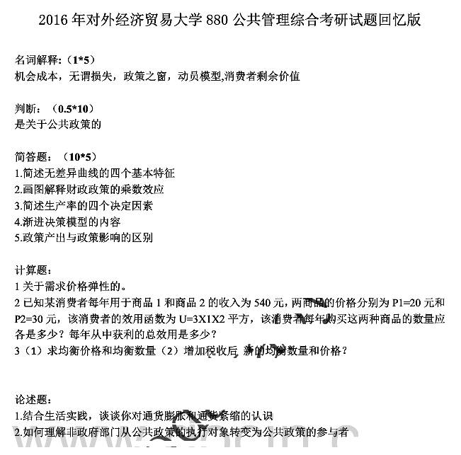 2016年对外经济贸易大学公共管理学院880公共管理综合考研真题