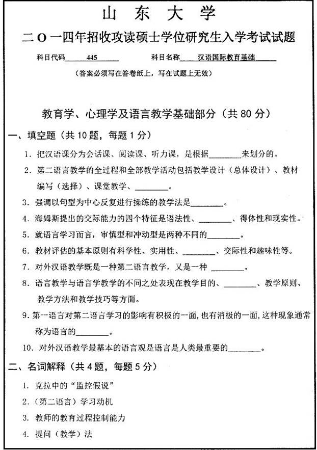 1. 山东大学国际教育学院《445汉语国际教育基础》历年考研真题汇总