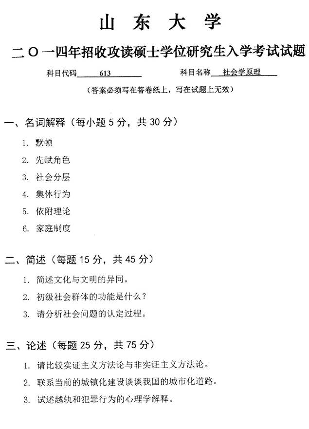 1. 山东大学哲学与社会发展学院《613社会学原理》历年考研真题汇总