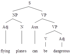 (1) The ambiguity comes from “flying planes”. It can be deciphered as “the planes that are flying” or “to fly planes”. Thus, the given sentence can be interpreted as “The planes that are flying can be dangerous.” or “To fly planes can be dangerous.” As for the above two meanings, they have the same surface meanings, but they differ in deep meanings, which can be clearly shown by their tree diagrams.