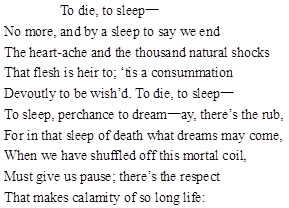 (1) This is an excerpt of the monologue by Hamlet in Hamlet written by William Shakespeare. This monologue reflects a kind of dilemma. It evokes a question: is there any meaning of man’s existence after death? Hamlet reflects Shakespeare’s humanist spirit. Hamlet’s personality of hesitation causes his tragedy.
