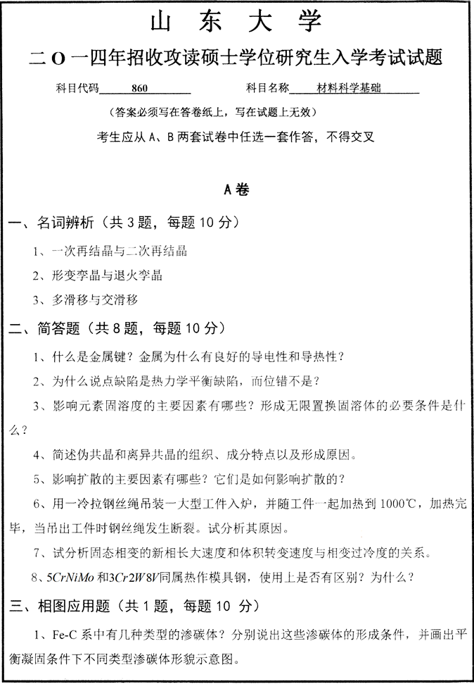 1. 山东大学《860材料科学基础》历年考研真题汇总