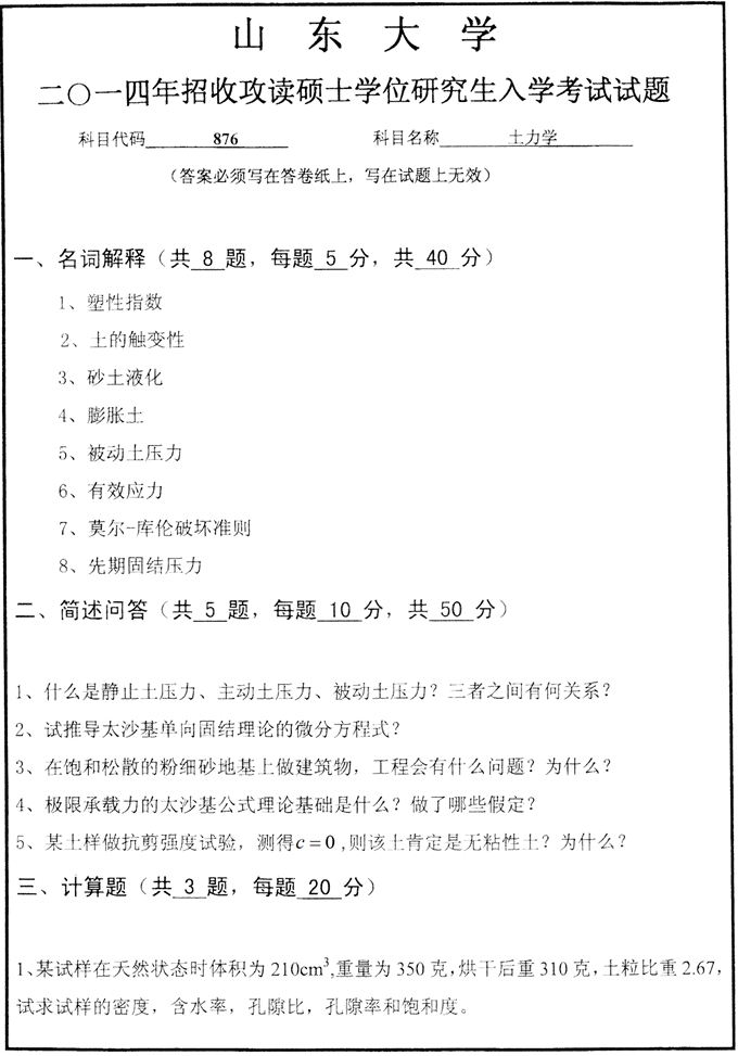 1. 山东大学齐鲁交通学院《876土力学》历年考研真题汇总