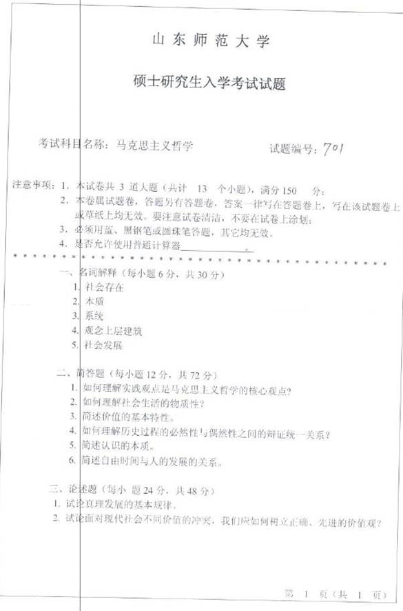 1. 山东师范大学《701马克思主义哲学》历年考研真题汇总