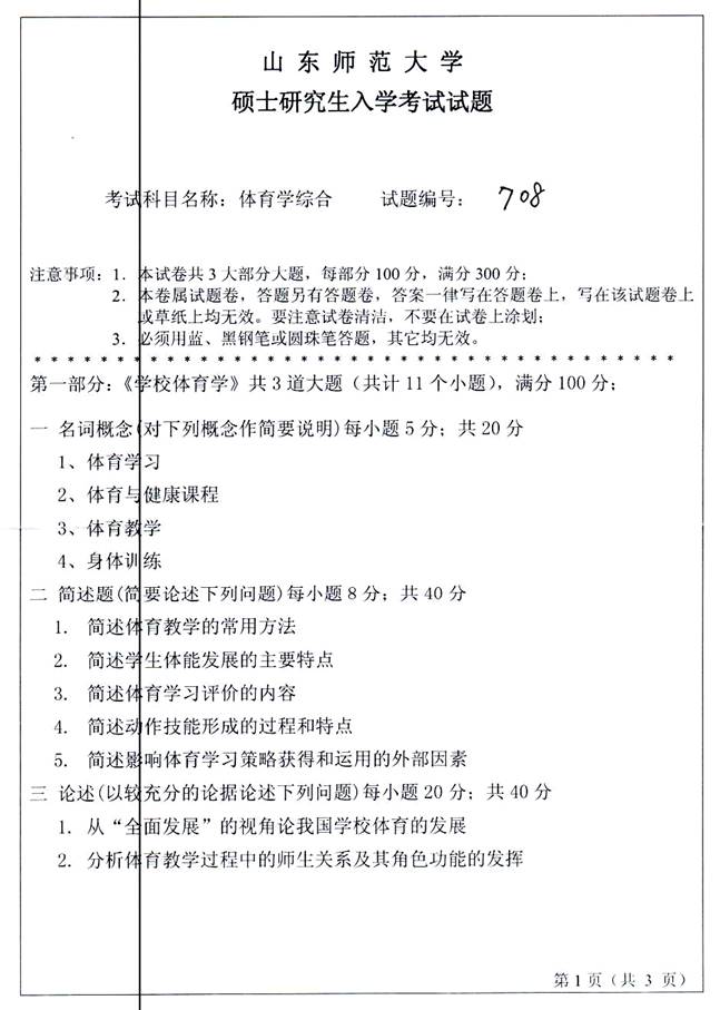 1. 山东师范大学体育学院《体育学综合(含学校体育学、体育心理学、人体生理学)》历年考研真题汇总
