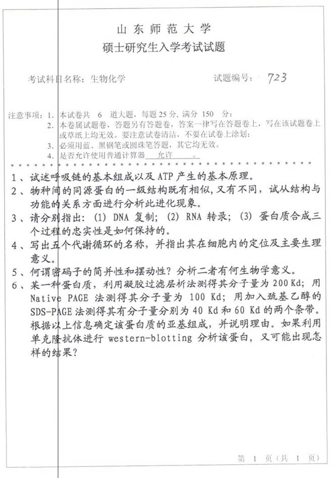 2012年山东师范大学723生物化学考研真题
