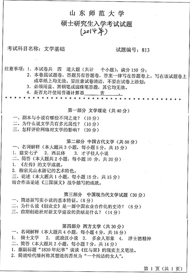 1. 山东师范大学文学院文学基础历年考研真题汇总