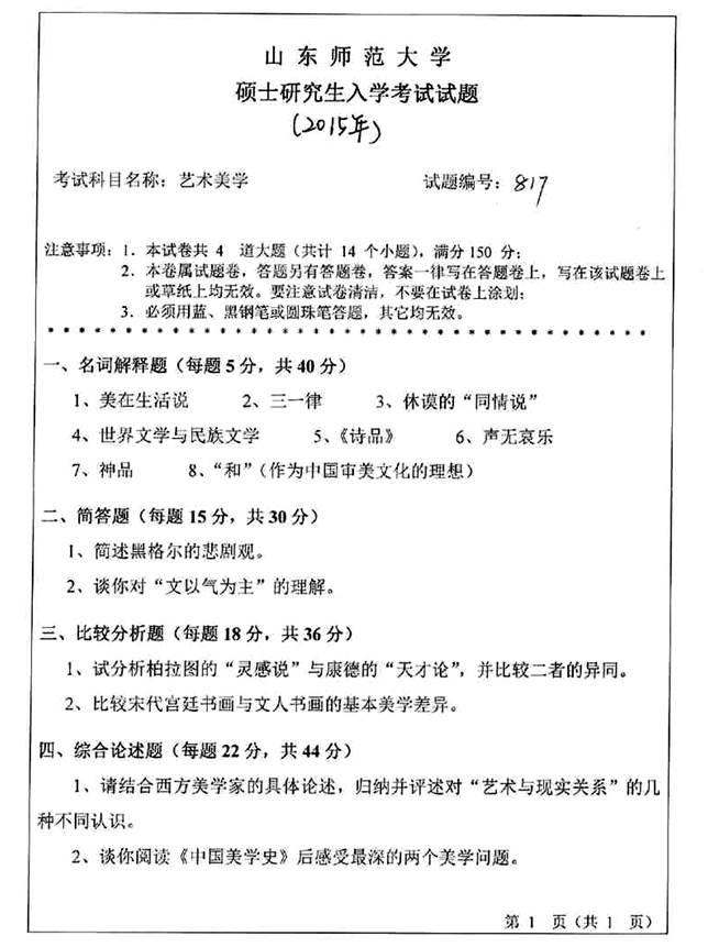 1. 山东师范大学美术学院《艺术美学》历年考研真题汇总
