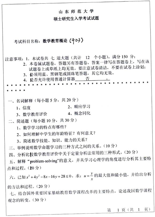 1. 山东师范大学数学与统计学院904数学教育概论[专业硕士]历年考研真题汇总