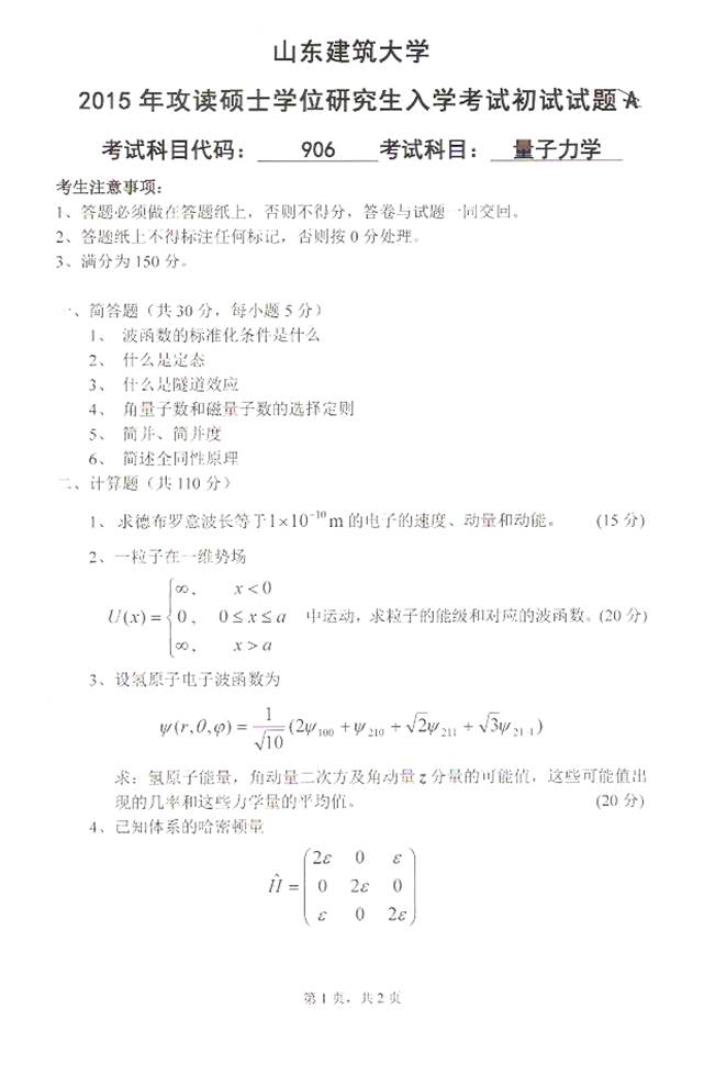 2015年山东建筑大学906量子力学考研真题