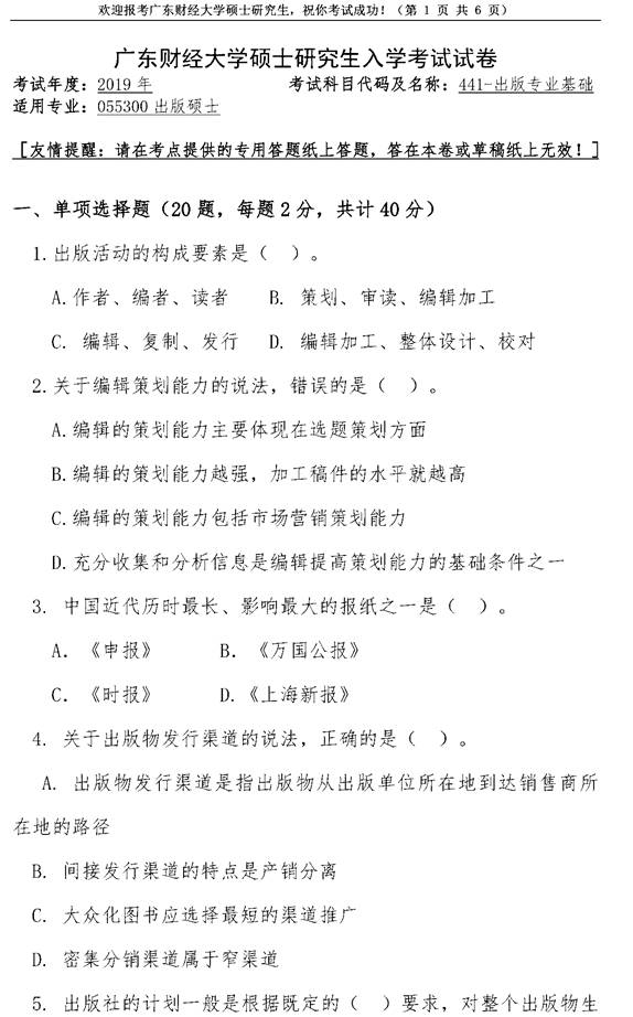 2019年广东财经大学441出版专业基础考研真题