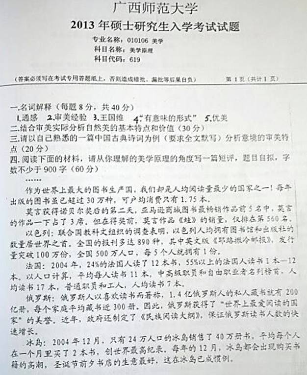 1. 广西师范大学文学院|新闻传播学院《619美学原理》历年考研真题汇总