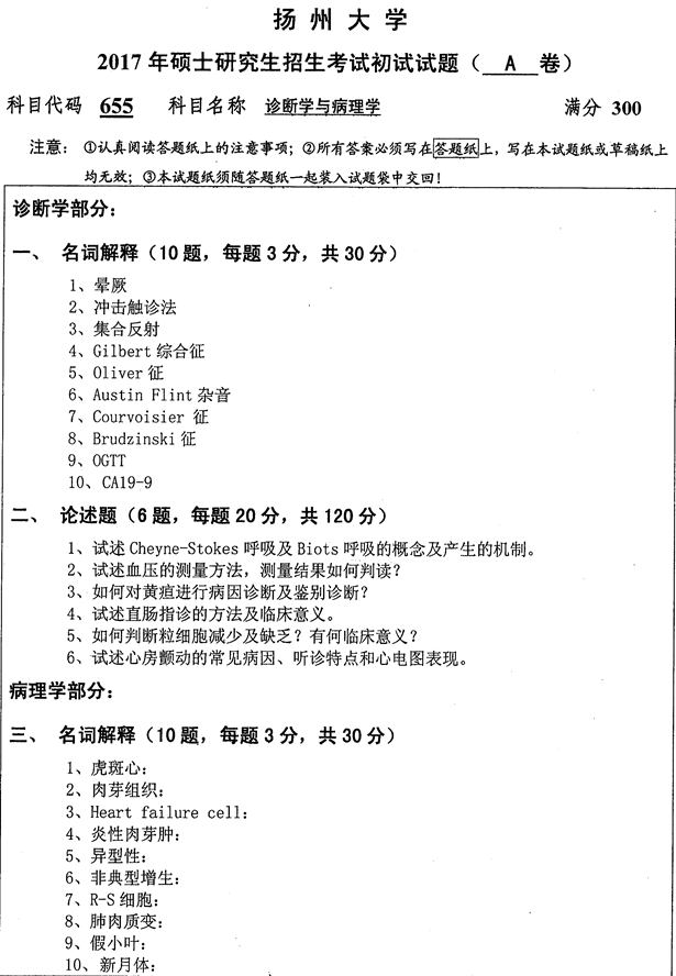 1. 扬州大学医学院(转化医学研究院)《655诊断学与病理学》历年考研真题汇总