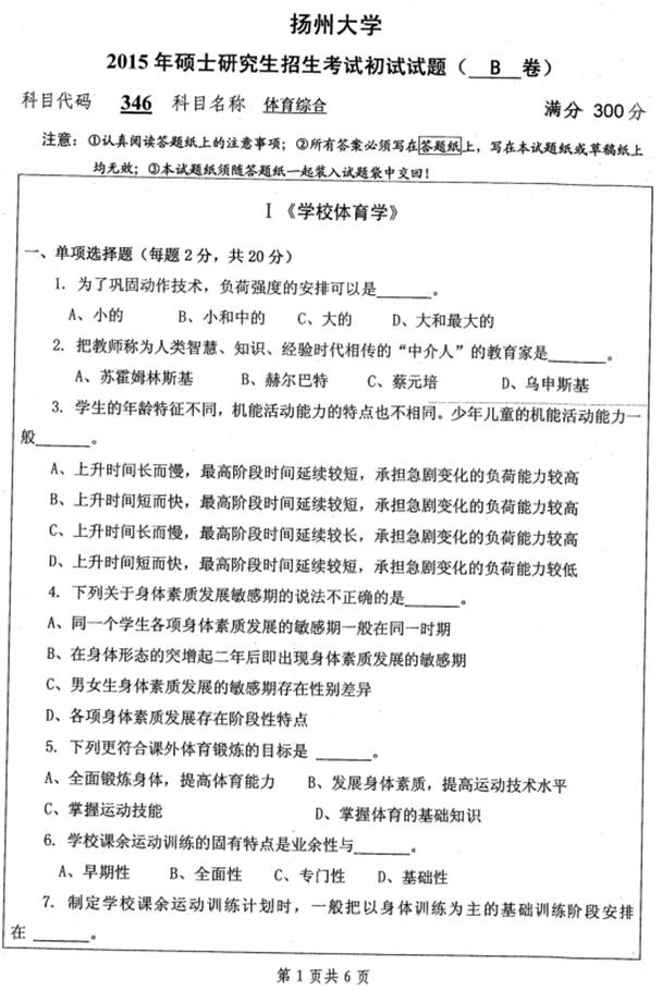 1. 扬州大学体育学院《346体育综合》[专业硕士]历年考研真题汇总