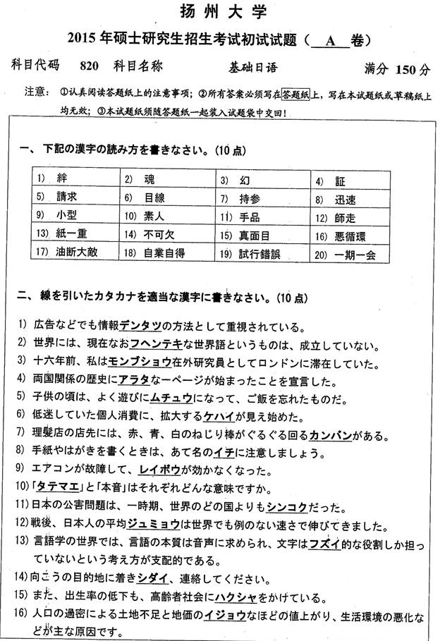 2015年扬州大学《820基础日语》考研真题(不完整)