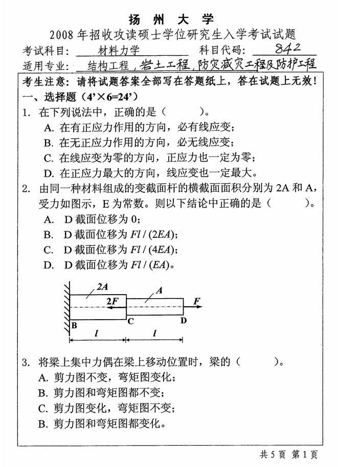 1. 扬州大学建筑科学与工程学院《843材料力学》历年考研真题汇总