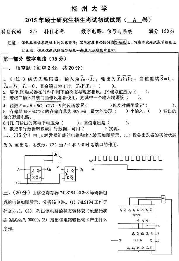 2015年扬州大学《875数字电路、信号与系统》考研真题
