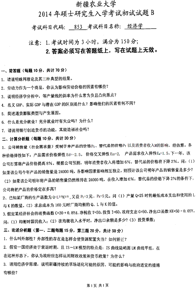 1. 新疆农业大学经济与贸易学院《853经济学》历年考研真题汇总