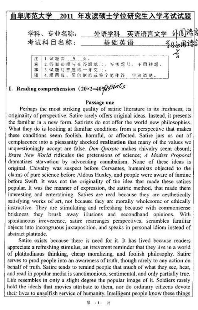 1. 曲阜师范大学外国语学院《705基础英语》历年考研真题汇总
