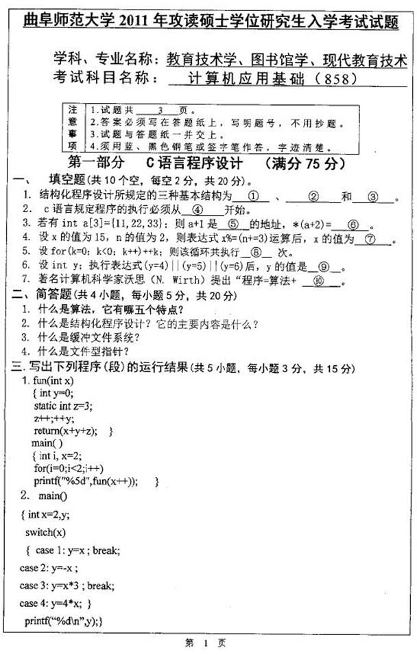 2011年曲阜师范大学858计算机应用基础考研真题