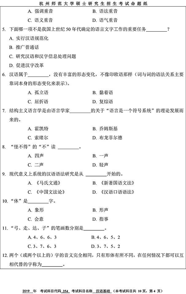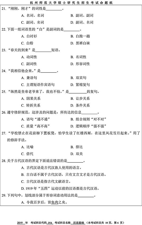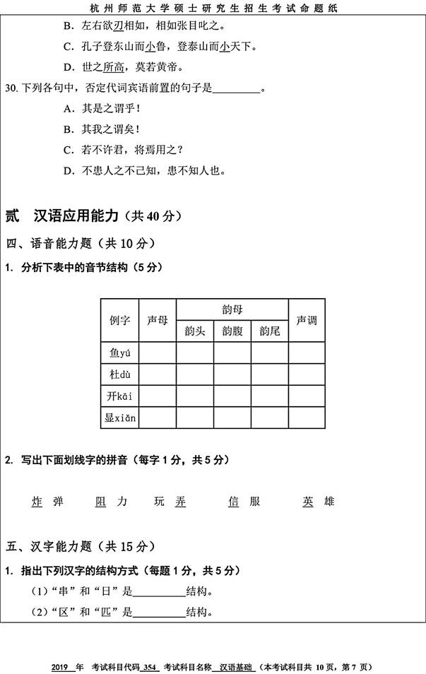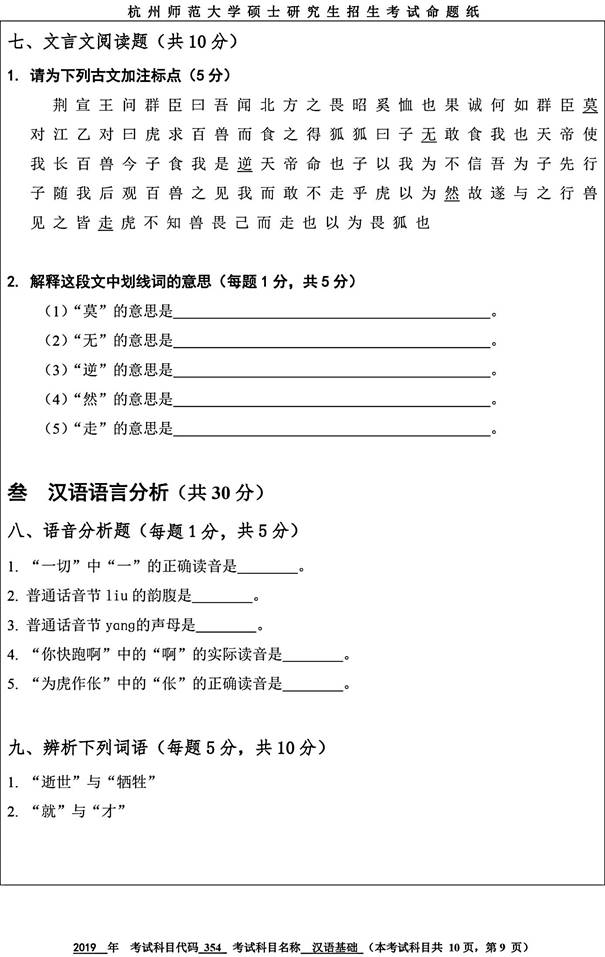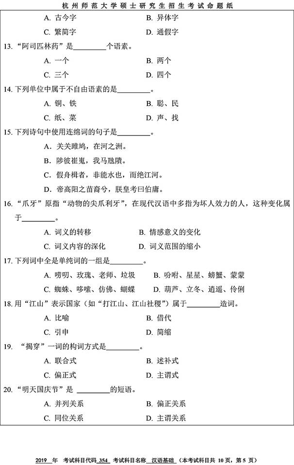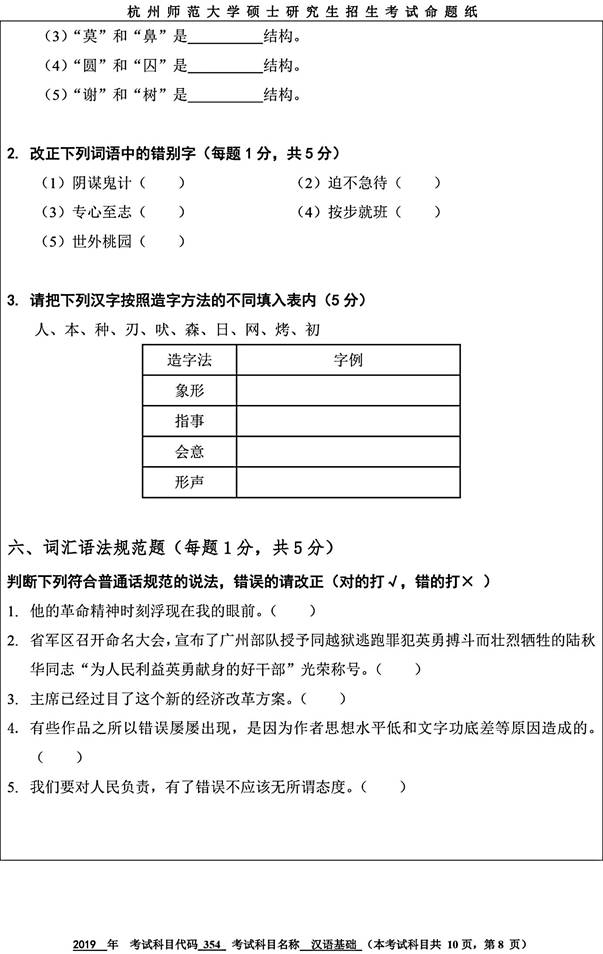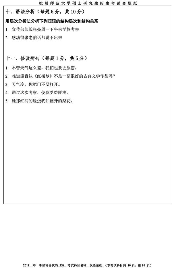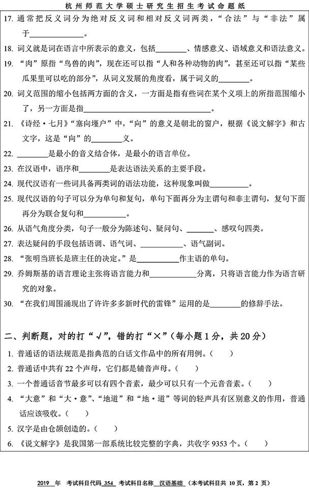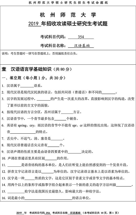 1. 杭州师范大学人文学院《354汉语基础》历年考研真题汇总