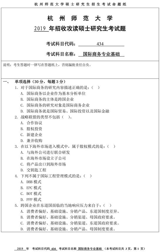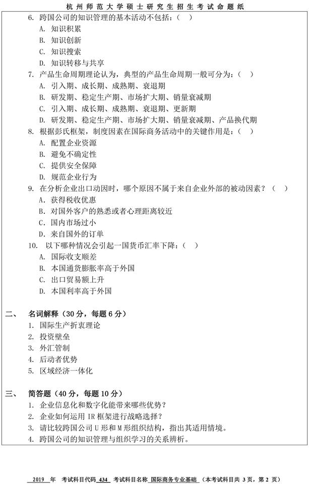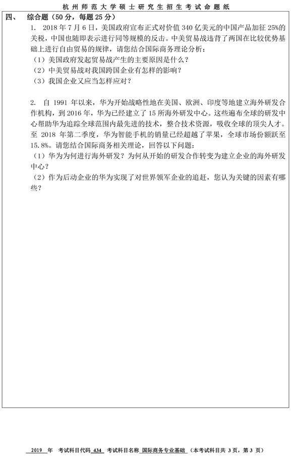 2019年杭州师范大学《434国际商务专业基础》考研真题