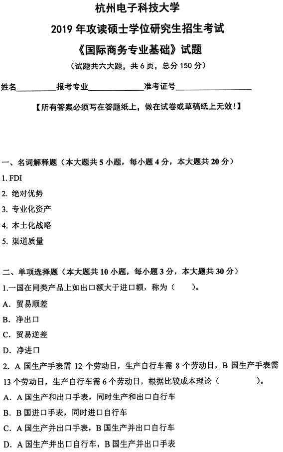 2019年杭州电子科技大学《434国际商务专业基础》考研真题